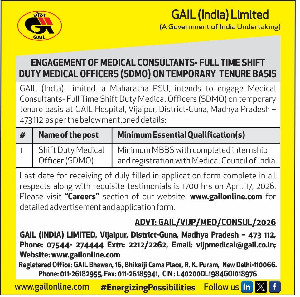 Engagement of Shift Duty Medical Officer on Temporary Tenure Basis at GAIL, PataADVERTISEMENT NO. GAIL/Pata/MS/Contract/Med Professionals/23-24