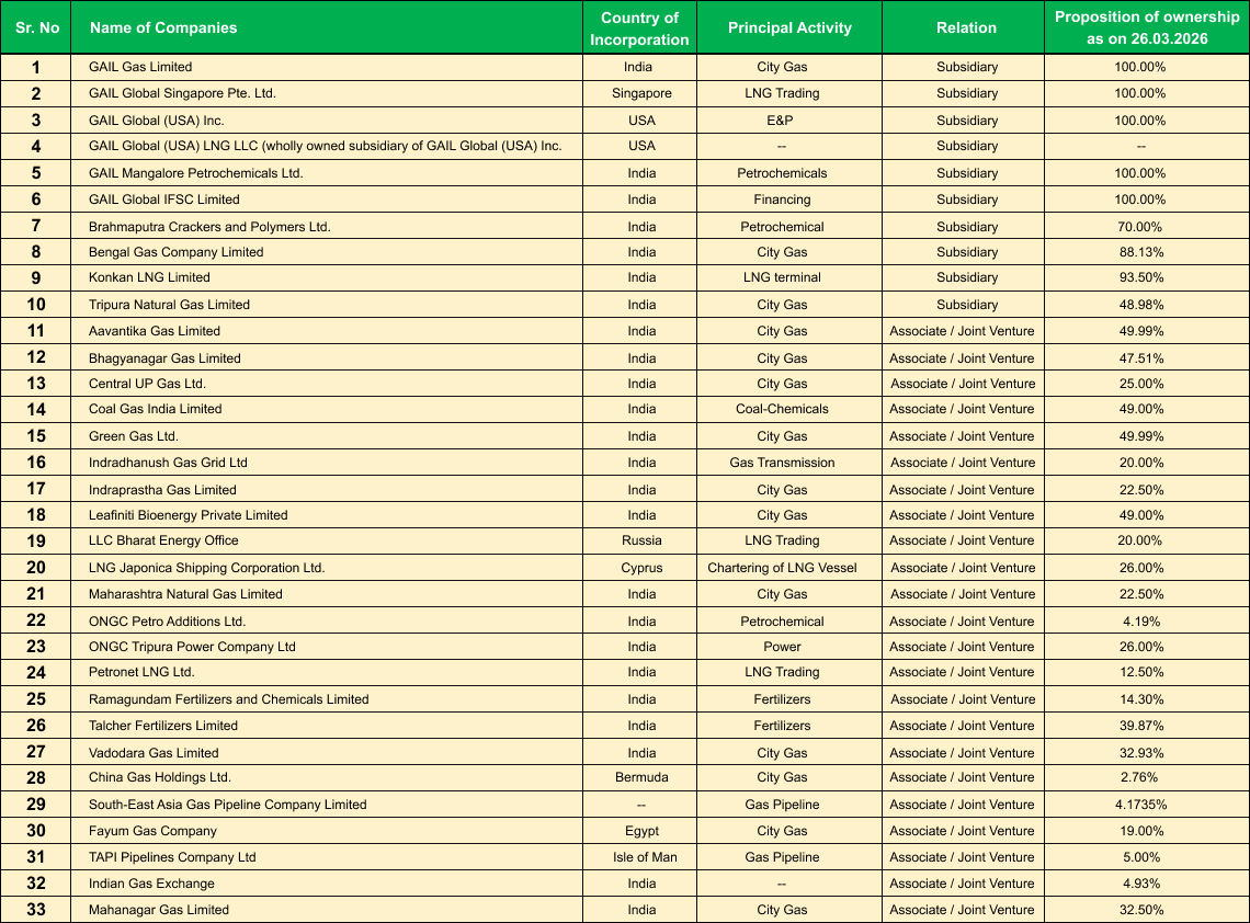 GAIL has formed Subsidiaries and Joint Venture companies for City Gas Distribution and Petrochemicals. GAIL is one of the pioneers to introduce City Gas Projects in India for gas supplies to households, commercial users and for the transport sector by forming Subsidiaries/ Joint Venture Companies.