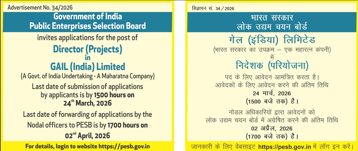 Selection for the post of Director (Projects), GAIL (India) LimitedADVERTISEMENT NO. 7/51/2019-PESB