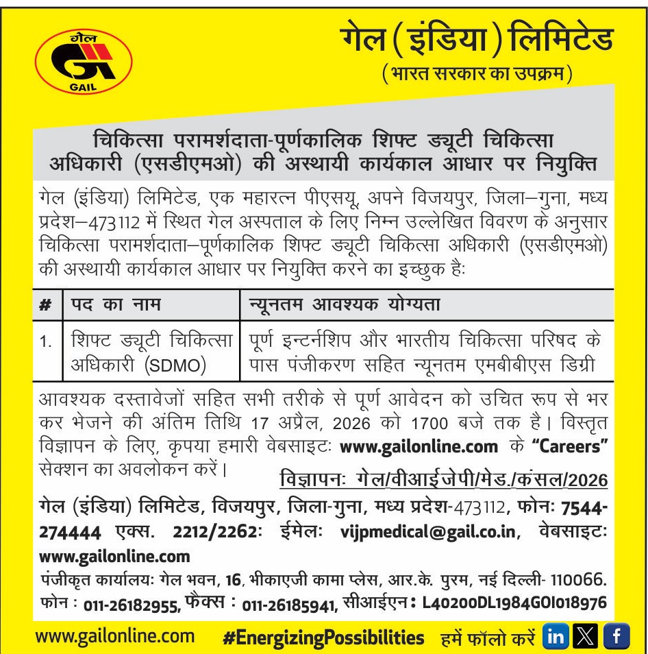 Engagement of Shift Duty Medical Officer on Temporary Tenure Basis at GAIL, PataADVERTISEMENT NO. GAIL/Pata/MS/Contract/Med Professionals/23-24