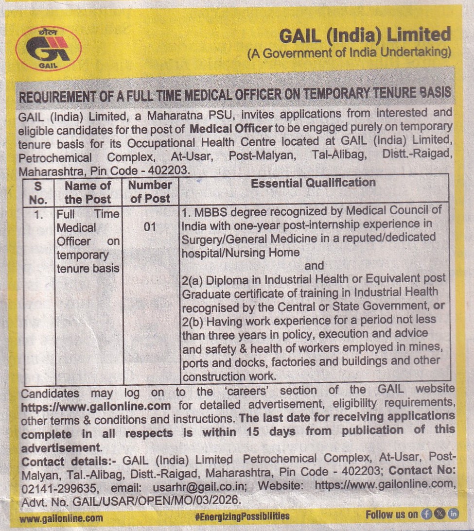 अस्थायी कार्यकाल के लिए गेल, उसर में चिकित्सा अधिकारी की नियुक्ति हेतु |