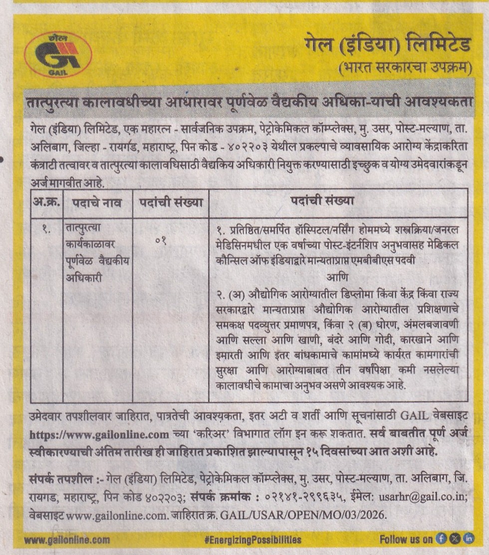 पार्ट टाइम के आधार पर अंशकालिक मेडिकल प्रोफेशनल के लिए वॉक-इन इंटरव्यूविज्ञापन सं. गेल/मुंबई/ एच आर /मेडिकल _कंस्लटेंट /2022/01